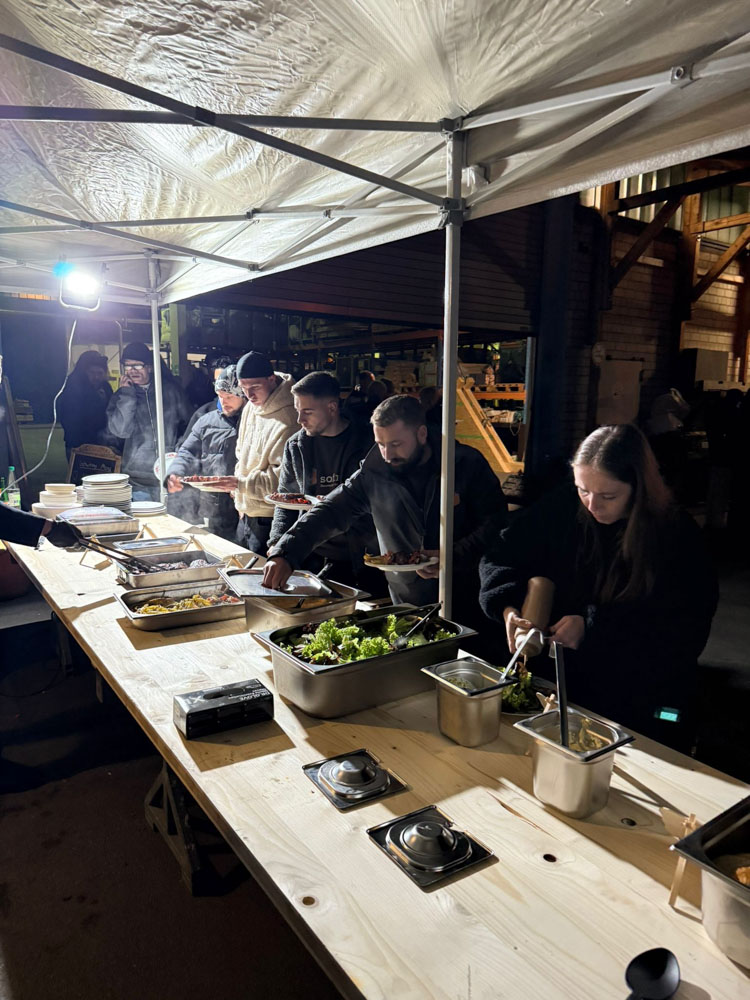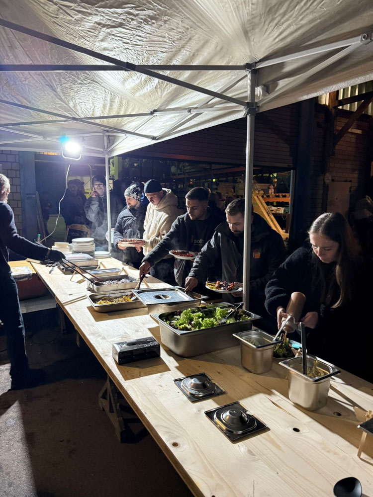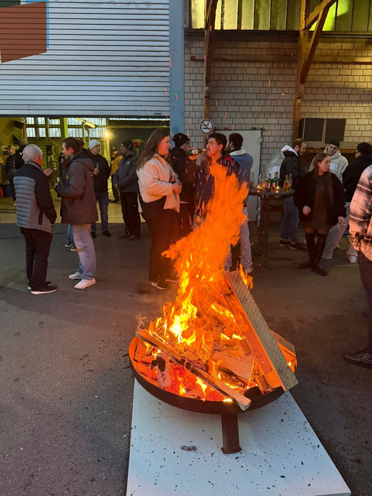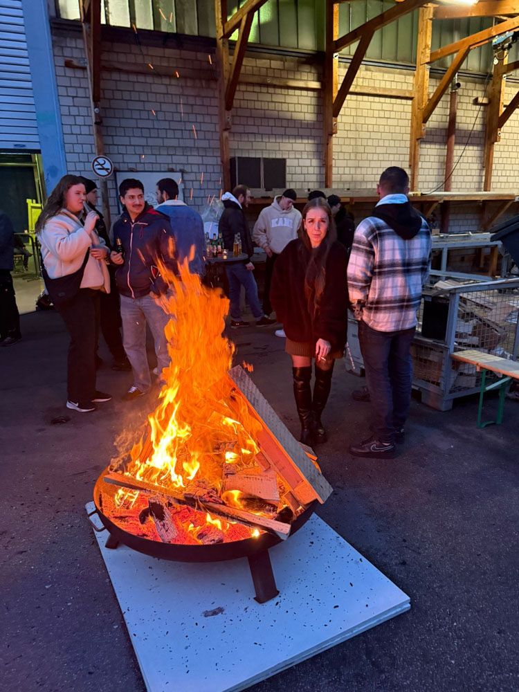 Eine große Feuerschale im Hof sorgte für wohliges Licht und das sanfte Knistern begleitete Gespräche und Lachen. Im Hof spielten wir kleine Spiele, tauschten Geschichten aus und ließen den Arbeitsalltag kurz hinter uns. Zum Essen gab es Gegrilltes: saftige Steaks, die mehrere Stunden am Grill zubereitet wurden und anschließend in gemütlicher Runde genossen. Wir blickten stolz auf ein ereignisreiches Jahr zurück. So ging der Abend ruhig, herzlich und zufrieden zu Ende.